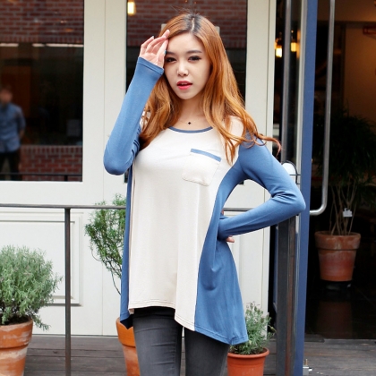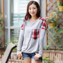 韩都衣舍秋装新款女装长袖圆领拼接宽松T恤JP3024