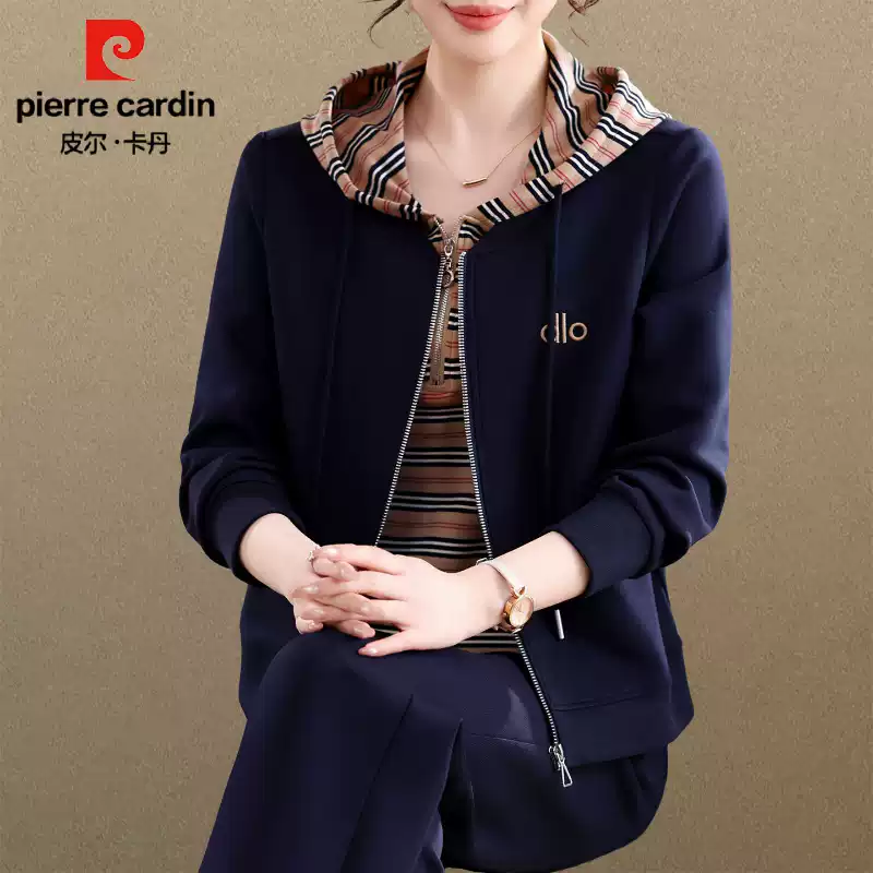 皮尔卡丹运动套装女春秋连帽拉链假两件宽松气质休闲服两件套